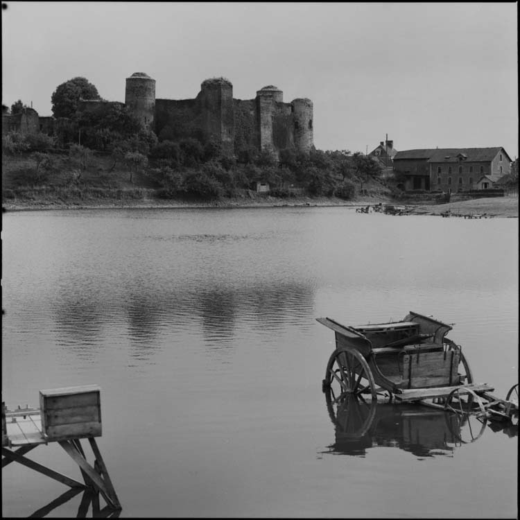 Château vu des rives de la Verzée. Carriole abandonnée dans la rivière