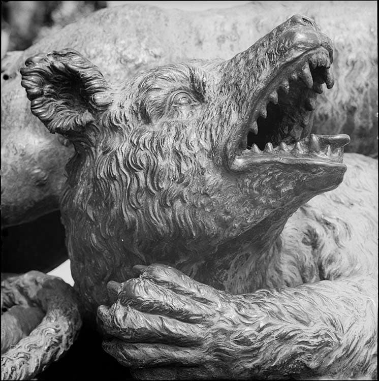 Jardins : fontaine du Point du jour, Tigre terrassant un ours, détail de la gueule de l’ours
