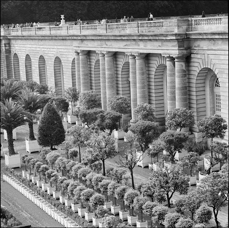 Visiteurs admirant le parterre de l’orangerie des hauteurs du parterre sud