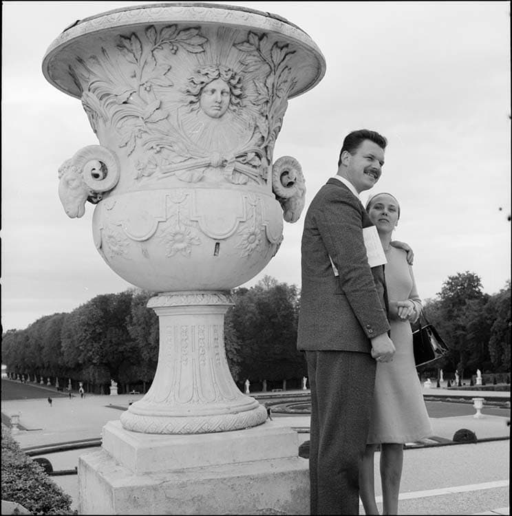 Jardins, parterre d’eau : vase à tête de bouc avec couple de visiteurs