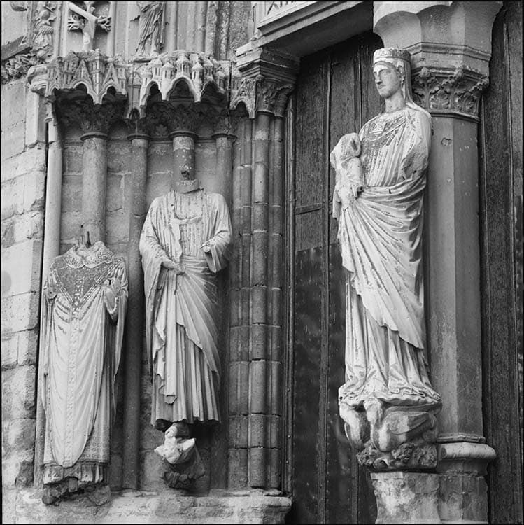 Portail occidental : Vierge à l'Enfant au trumeau et statues décapitées de l’ébrasement gauche