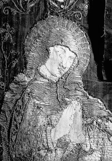 Bannière en velours cramoisi à personnages brodés en soies de couleur : Crucifixion, buste de la Vierge