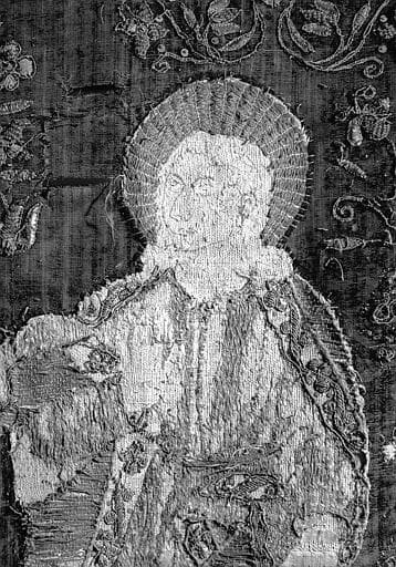 Bannière en velours cramoisi à personnages brodés en soies de couleur : Crucifixion, buste de saint Jean