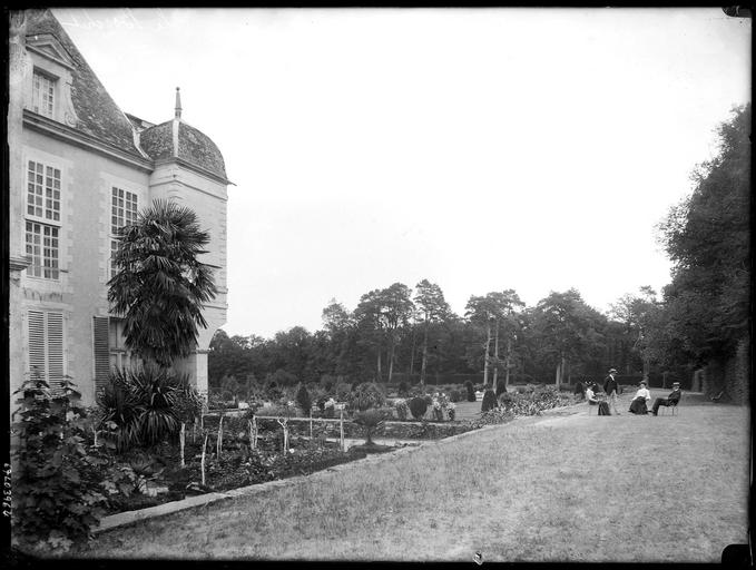 POP | Plateforme ouverte du patrimoineParc : les châtelains assis sur des chaises de jardin, détail de la façade