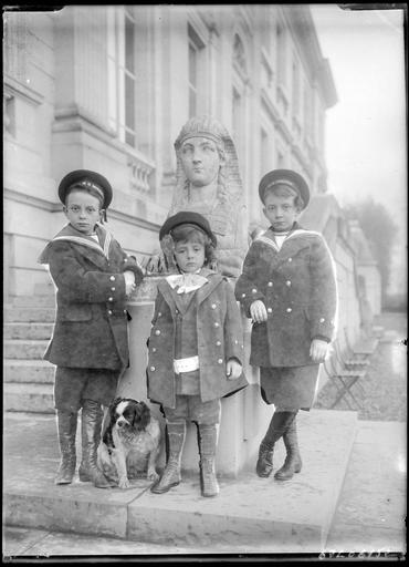 POP | Plateforme ouverte du patrimoinePortrait de trois enfants et un chien devant une sculpture de sphinx