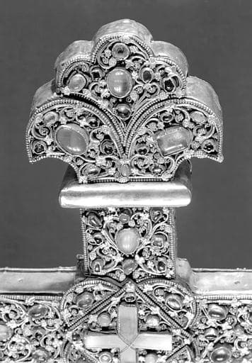 POP | Plateforme ouverte du patrimoineCroix reliquaire de Clairmarais en argent doré, nielles, filigranes et cabochons, avers, Fleuron (filigrané)