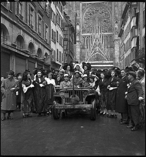 POP | Plateforme ouverte du patrimoineDes Strasbourgeoises en costume traditionnel accueillent leurs héros