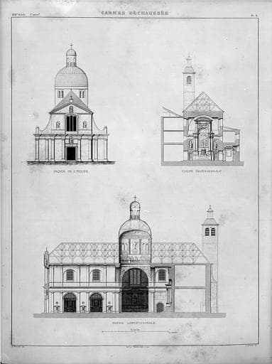 Elévation de la façade, coupe longitudinale, coupe transversale