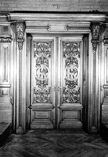 Mur sud du grand amphithéâtre, porte de l'estrade en bois sculpté et découpé