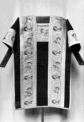 Dalmatique en velours rouge ornée d'orfrois jaune à décor de fleurs rouges et violettes, sacristie