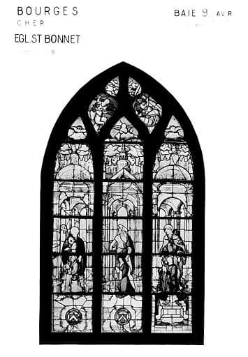Panneau de vitrail, baie 9 : Saint Denis, saint Jean-Baptiste, saint Antoine et donateurs