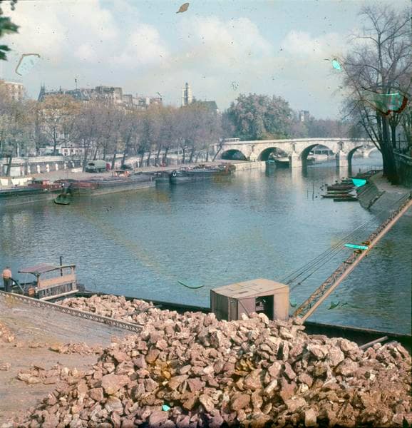 Vue sur le pont du quai Henri-IV, grue chargeant une péniche au premier plan