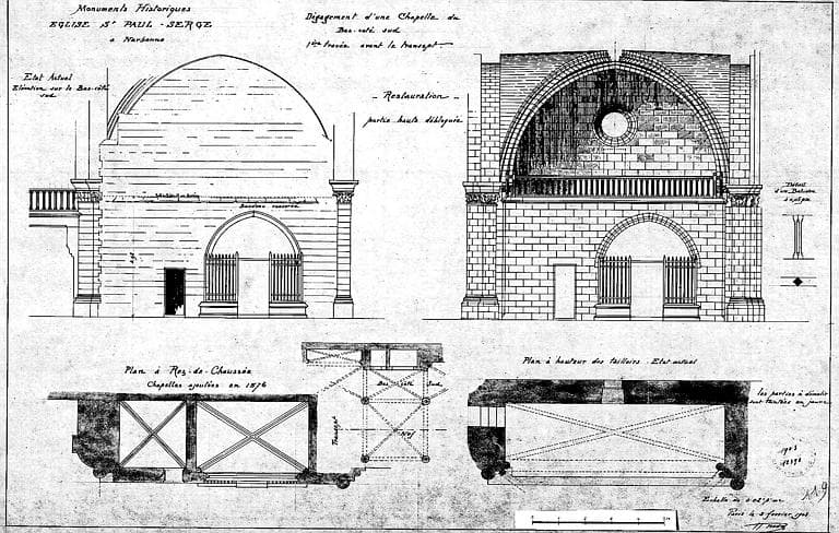 POP | Plateforme ouverte du patrimoineDégagement d'une chapelle du bas-côté sud : Elévations et plans (état actuel et état restauré)