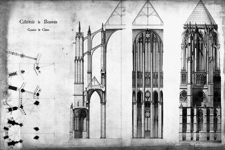 POP | Plateforme ouverte du patrimoineElévation, coupe et plan de trois travées du choeur