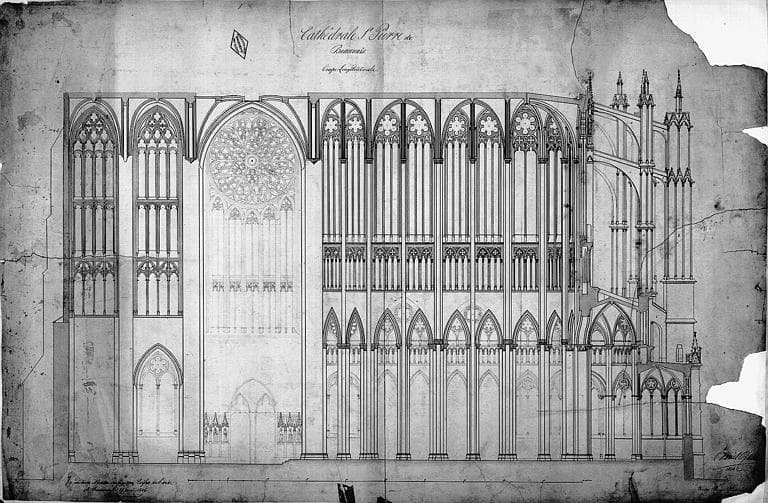 POP | Plateforme ouverte du patrimoineCoupe longitudinale de l'église avec la travée supplémentaire projetée à l'ouest (1er projet)