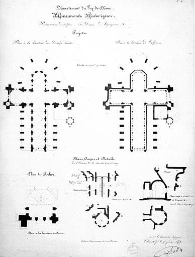 POP | Plateforme ouverte du patrimoineProjet de restauration : Plan à la hauteur des croisées hautes. plan à la hauteur du triforium. Plan du clocher. Plan, coupe et détails de l'escalier de la tourelle au 1e étage