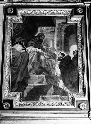 POP | Plateforme ouverte du patrimoinePeinture murale de la chapelle d'Estampes de Valençay (registre inférieur, côté droit) : Scène de la vie de saint Dominique. Saint Dominique demande à Innocent III l'autorisation de fonder l'ordre des frères prêcheurs