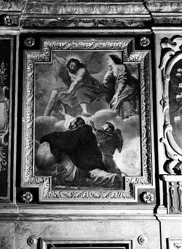 POP | Plateforme ouverte du patrimoinePeinture murale de la chapelle d'Estampes de Valençay (registre inférieur, côté droit) : Scène de la vie de saint Dominique. Vision de Saint-Dominique. Le Christ aux trois flèches
