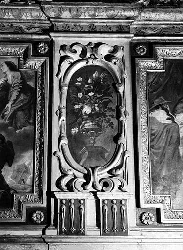 Peinture murale de la chapelle d'Estampes de Valençay (registre inférieur) : Vase de fleurs peint entouré d'un décor sculpté
