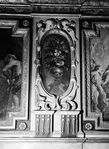 Peinture murale de la chapelle d'Estampes de Valençay (registre inférieur, côté gauche) : Vase de fleurs peint entouré d'un décor sculpté