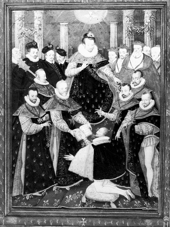 Aquarelle sur vélin : Henry III tenant le premier chapitre du Saint-Esprit