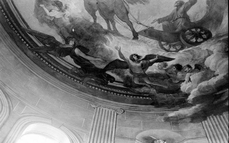 Peinture murale de la coupole : angelots soutenant la voûte céleste et accompagnant le char