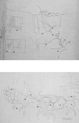 Deux relevés recouverts de calques numérotés 33 à 43 et 64 à 72