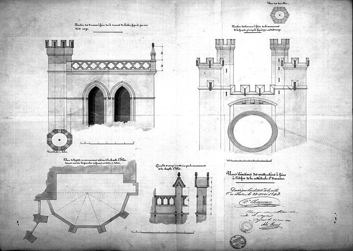 POP | Plateforme ouverte du patrimoineProjets de couronnement : Plan de l'abside. Détail des parties hautes de la façade principale du clocher. Détail des pinacles et de la rampe à construire pour le couronnement de la chapelle Saint-Félix (abside)