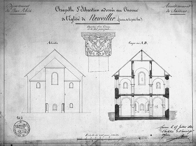 Chapelle de Saint-Sébastien (adossée au choeur de l'église) : Coupes et chapiteau de la nef