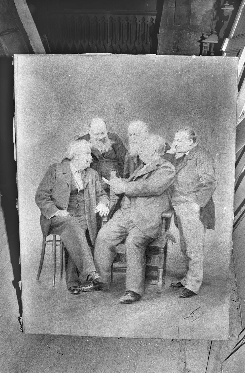 Contretype d'un agrandissement du groupe des cinq, de gauche à droite: Félix Nadar, Sylvestre, Mariani, Louis Lumière et Bourguignon