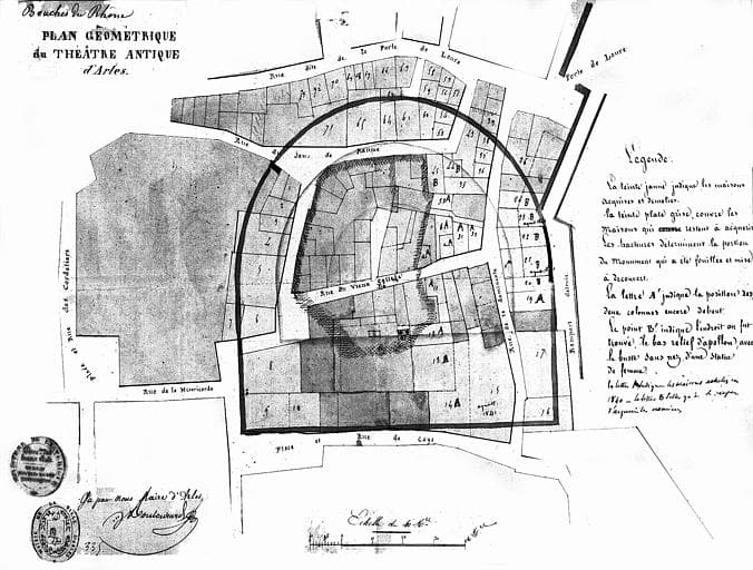 POP | Plateforme ouverte du patrimoinePlan du théâtre et de ses abords, indiquant par des numéros les maisons qui restent à acquérir