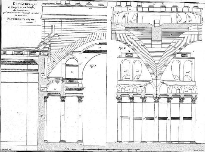 Dessin : Elévation et coupe sur l'angle des grands arcs qui soutiennent la colonnade extérieure du dôme