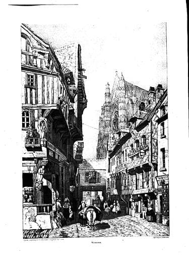 Lithographie : Vue générale du carrefour de la rue de la Taillerie et de la cathédrale dans le fond