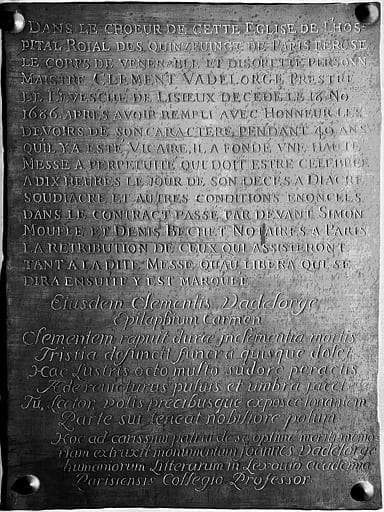 Plaque de cuivre de la chapelle : Plaque funéraire et de fondation de messes du prêtre Clément Vadelorge mort en 1686