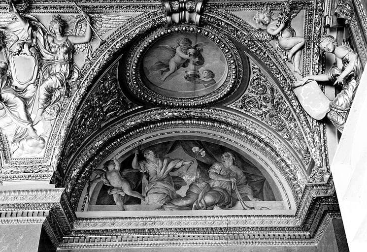 POP | Plateforme ouverte du patrimoineAppartements d'Anne d'Autriche, plafond peint de la salle des Antonins (ancienne chambre) : La Continence et la Vertu (lunette) et Les Génies des Eaux (médaillon)