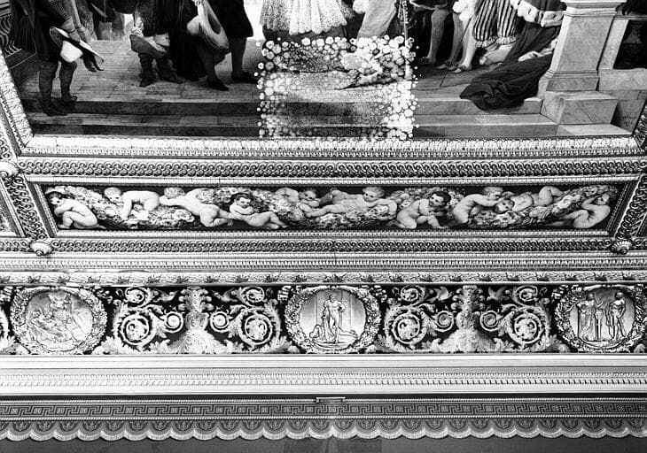 Galerie Campana, 1e salle, trois médaillons sculptés en bas-relief sur la voussure nord : Travaux d'Hercule