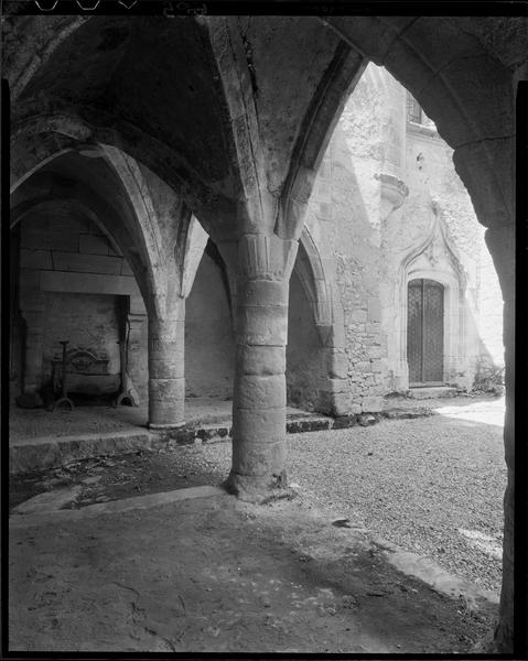 Cour intérieure avec galerie voûtée d'ogives et ses traces de décors peints ; cheminée