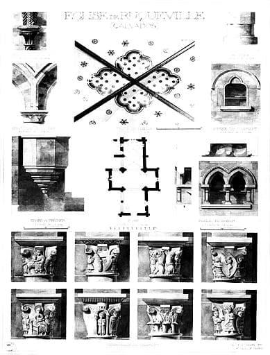 Plan général, chapiteaux, voûte du choeur, piscine du choeur, piscine du transept et chaire à prêcher (aquarelle)