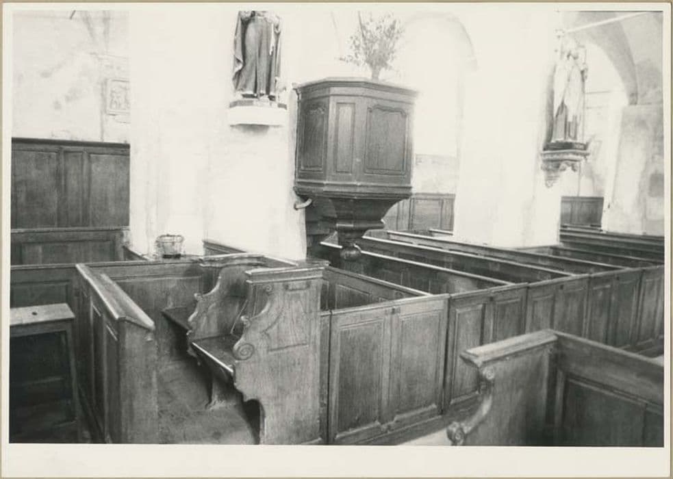 bancs de fidèles, chaire à prêcher et deux stalles