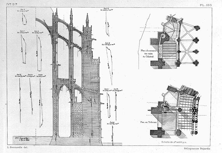 POP | Plateforme ouverte du patrimoineHéliogravure : Coupes du pilier extérieur (étude de stabilité), plan à la naissance des voûtes du collatéral et plan du triforium