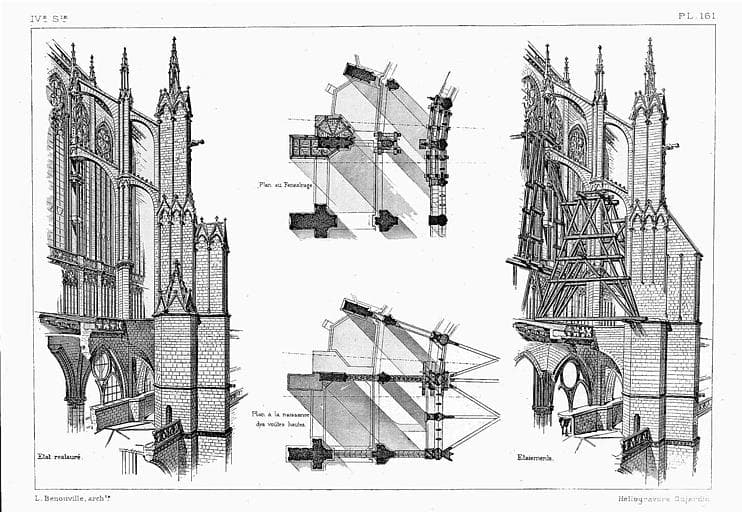 Héliogravure : Coupes du pilier extérieur (état restauré et étaiements), plan à la naissance des voûtes du collatéral et plan du triforium (état restauré)