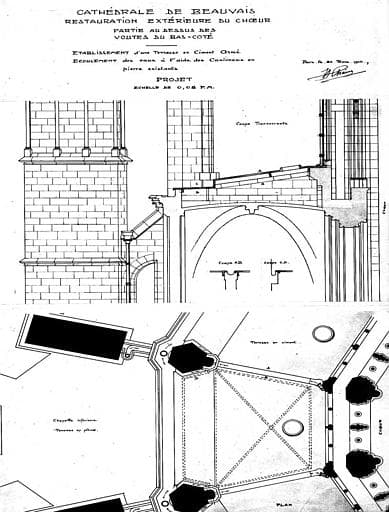 POP | Plateforme ouverte du patrimoineProjet de restauration extérieure du choeur : Plan et coupe transversale de la partie au-dessus des voûtes du bas-côté