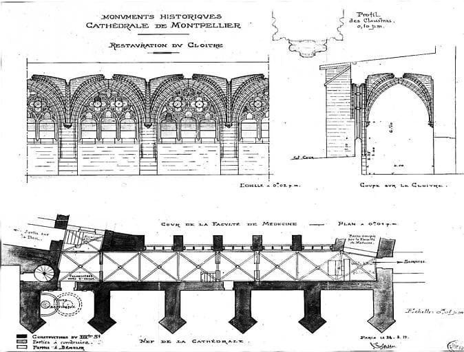 Restauration du cloître : Elévation de trois travées, coupe sur le cloître et plan