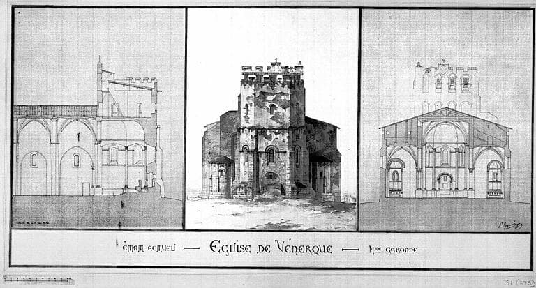 POP | Plateforme ouverte du patrimoineCoupe longitudinale, élévation de la façade est, et coupe transversale vers l'est (état actuel)