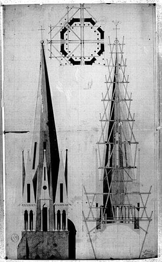 Clocher : Elévation, coupe et plan (plume et aquarelle)