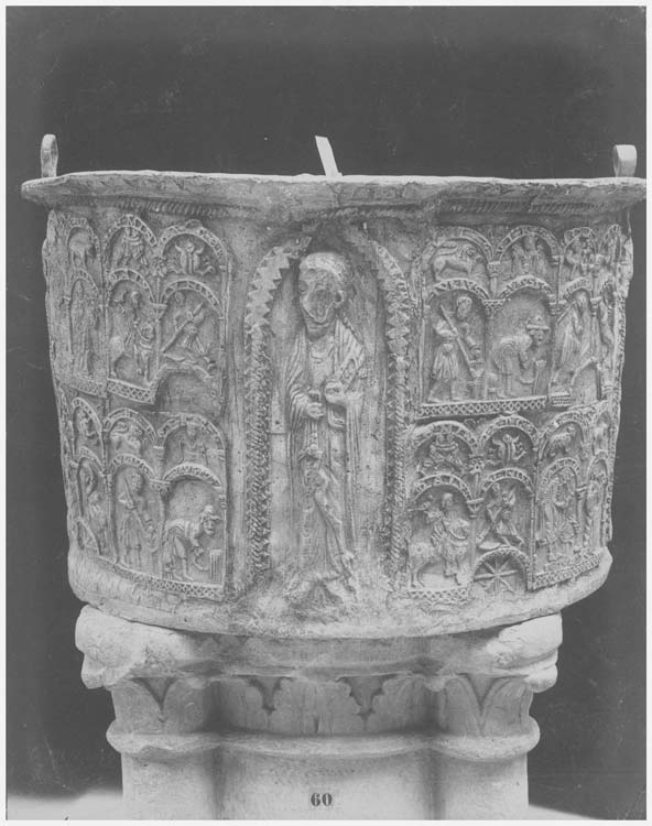 [Sur l'épreuve, dans la marge, en bas à gauche] T 60 Art Roman – Cuve baptismale (Eglise de Saint-Evroult de Montfort) ; [En bas à droite] A.G. Phot. ; [Sur la planche, imprimé, en bas à gauche] Bibliothèque photographique - A. GIRAUDON ; [En bas à droite] 15, rue Bonaparte, Paris