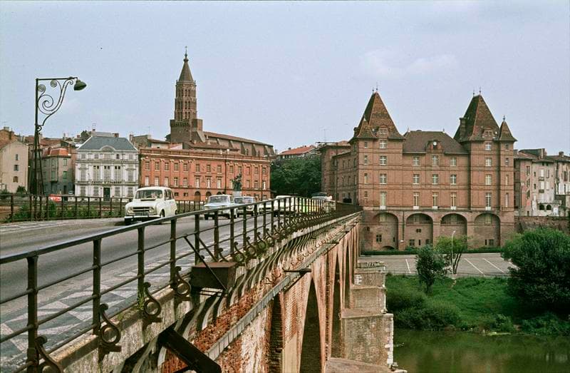 POP | Plateforme ouverte du patrimoineVue générale de la ville : voitures sur le pont, façades du tribunal de commerce et du musée Ingres, clocher de l'église à l'arrière-plan