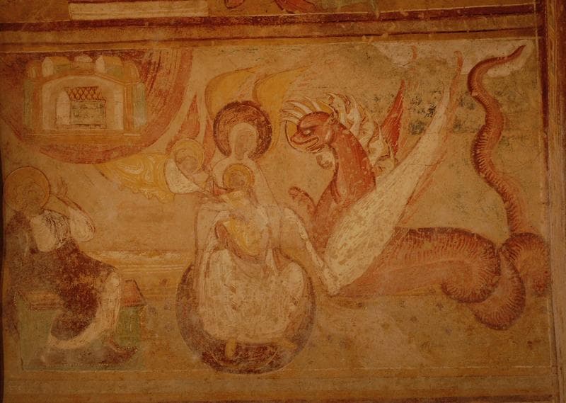 détail des peintures du porche : scènes de l'Apocalypse selon saint Jean