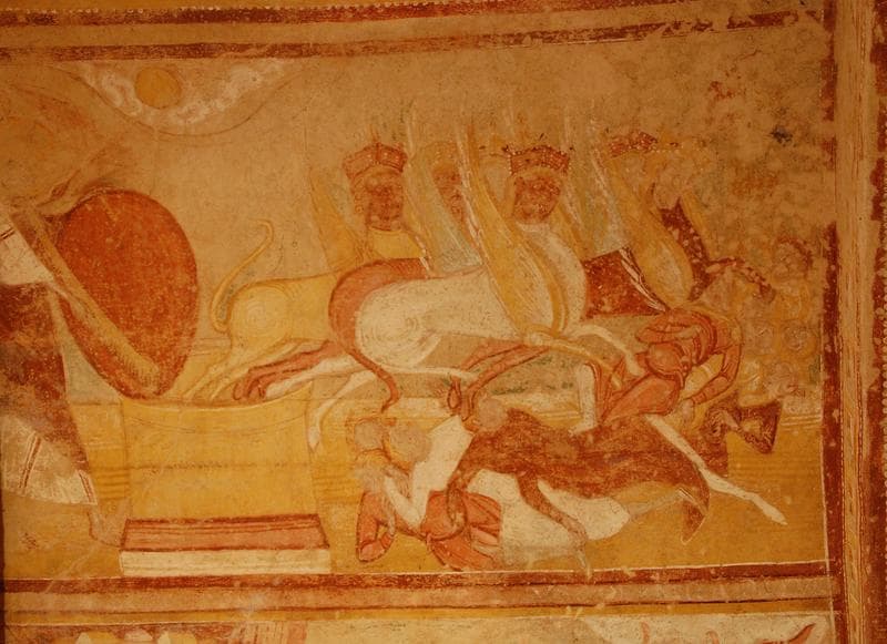 détail des peintures du porche : scènes de l'Apocalypse selon saint Jean