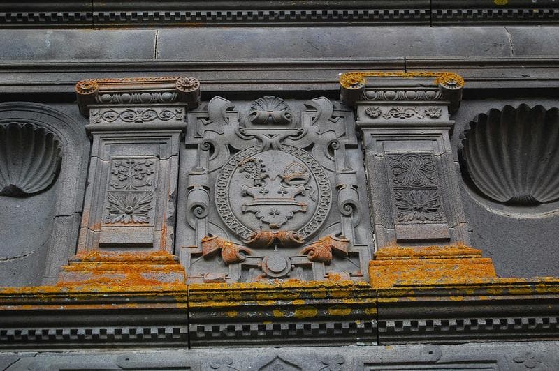 POP | Plateforme ouverte du patrimoinevue partielle du décor du porche d'accès occidental de l'église abbatiale : armes de Guillaume Duprat